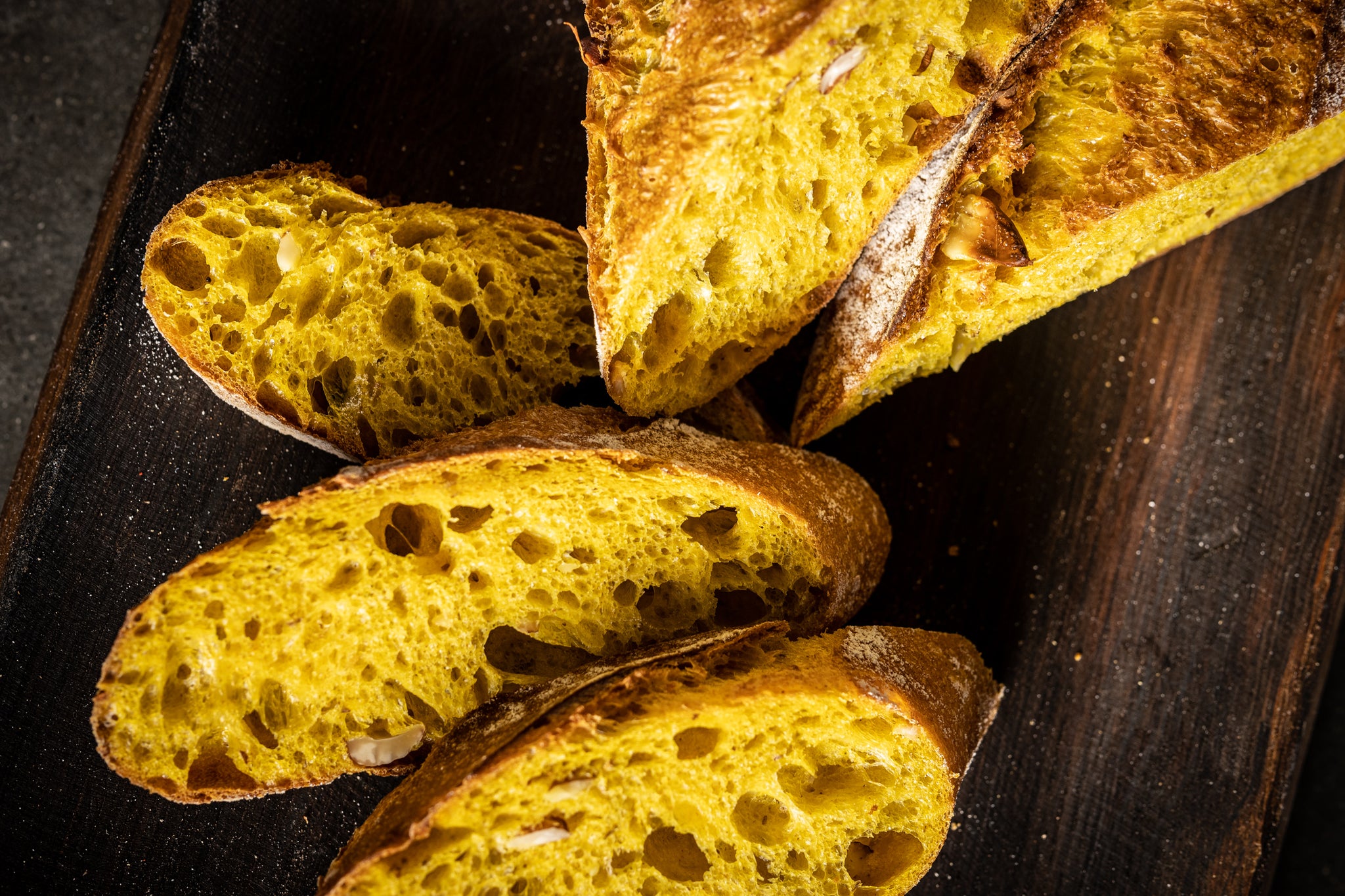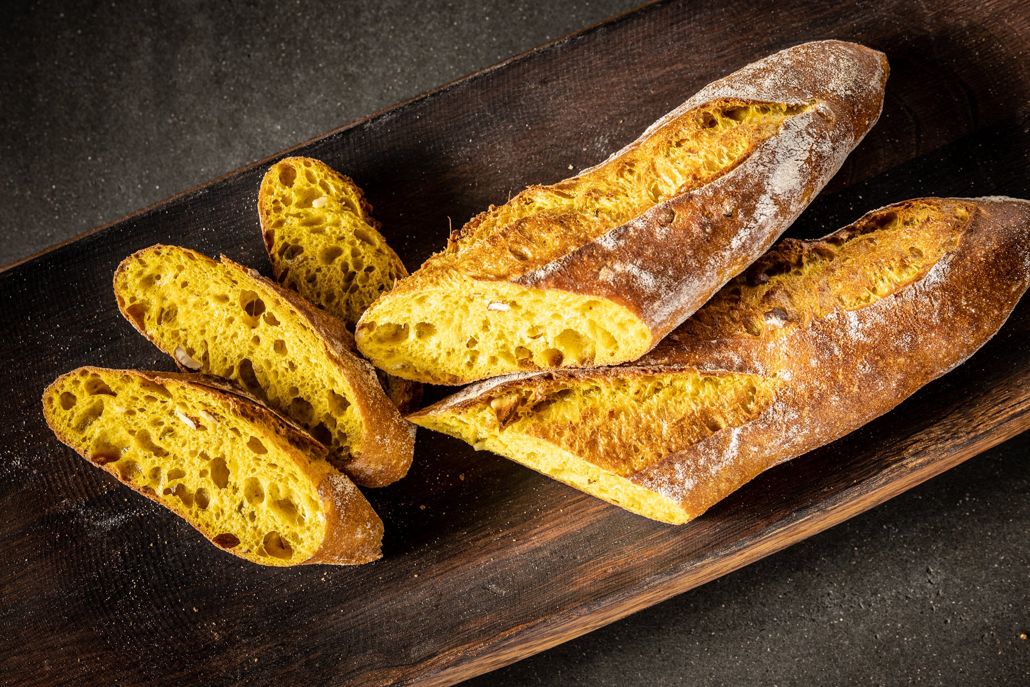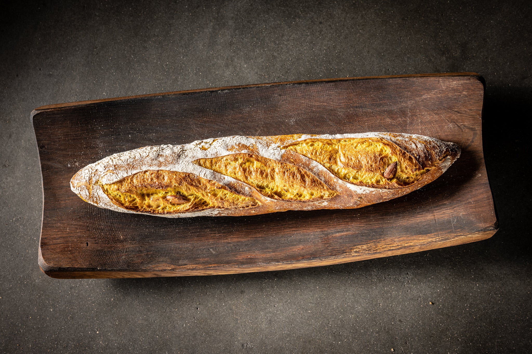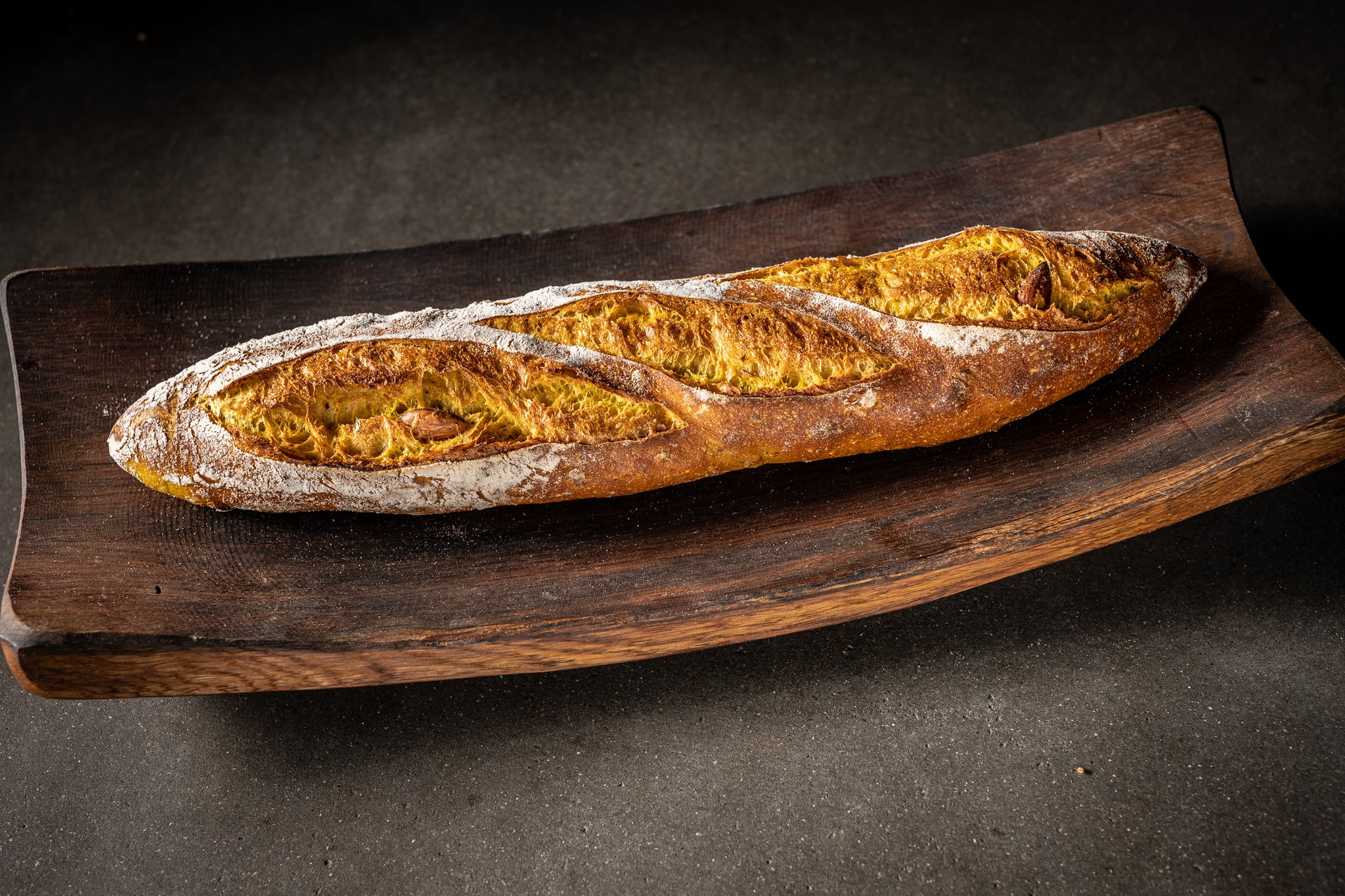Unsere Extravagantes Kurkuma-Mandel-Baguette. Feinsplittrige Kruste mit zarter Karamellnote verleiht jedem Bissen einen Hauch von Luxus, während die goldgelbe, grobe Porung mit Kurkuma Gewürzen ein visuelles Fest für Ihre Augen bietet Der reichhaltige, nussige Geschmack durch die gerösteten Mandeln, kombiniert mit dem Poolish und über die Nacht perfektionierten Aromen Entwicklung, macht dieses Baguette zu einer wahrhaft Harmonische Begleitung zu feinen Curry-Süppchen oder zartem Hühnchen.